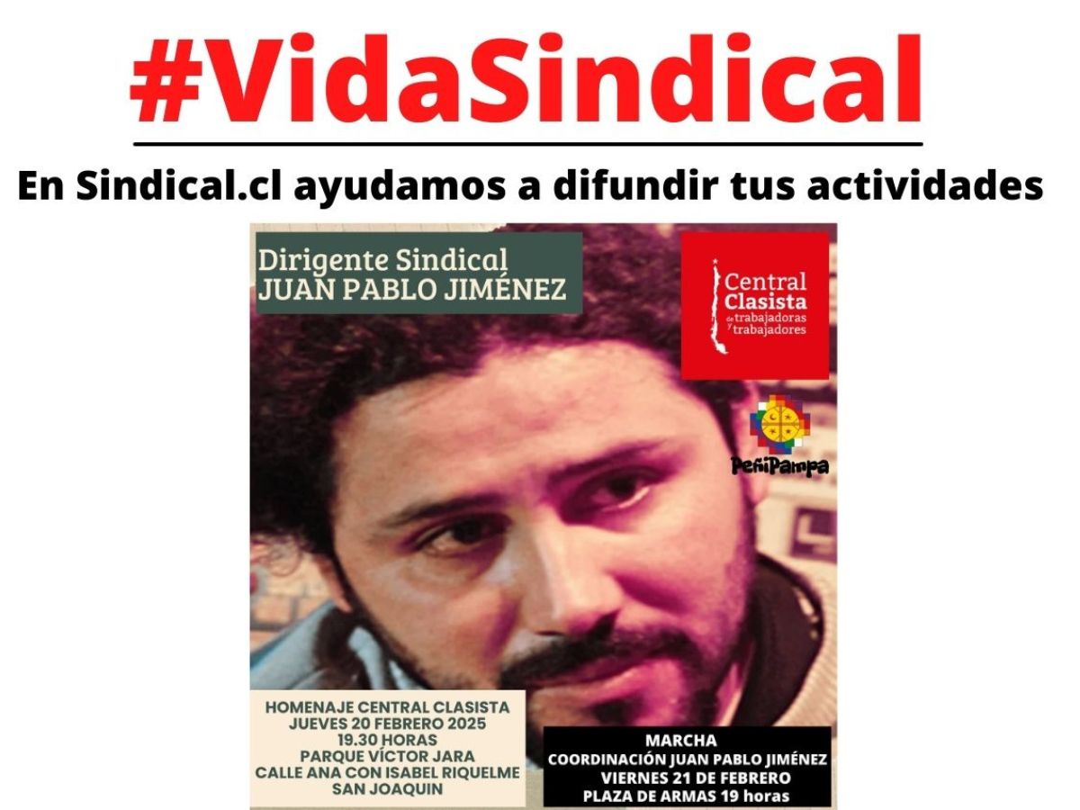 La Central Clasista de Trabajadoras y Trabajadores invita a un acto de homenaje a Juan Pablo Jiménez en el lugar donde trabajaba y se desempeñaba como dirigente sindical. La convocatoria es el jueves 20 de febrero a las 19:30 en el Parque Víctor Jara, en calle Ana con Isabel Riquelme, cercano al metro estación BíoBío.